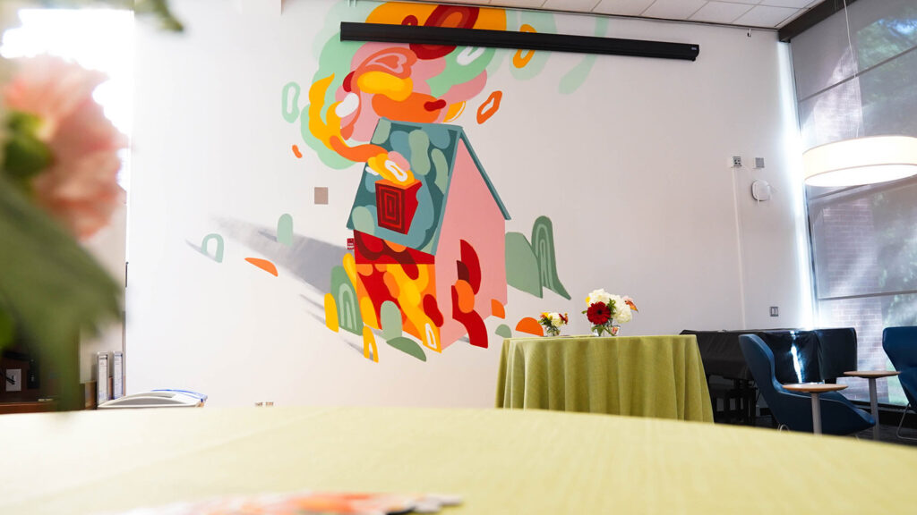 The mural, 25 feet wide and 15 feet high, occupies the west wall of Caldwell Hall Lounge — long a space for discussion, reflection and community. Its central theme is transformation, depicted by three students becoming who they aspire to be and stepping into the future they aim to create.